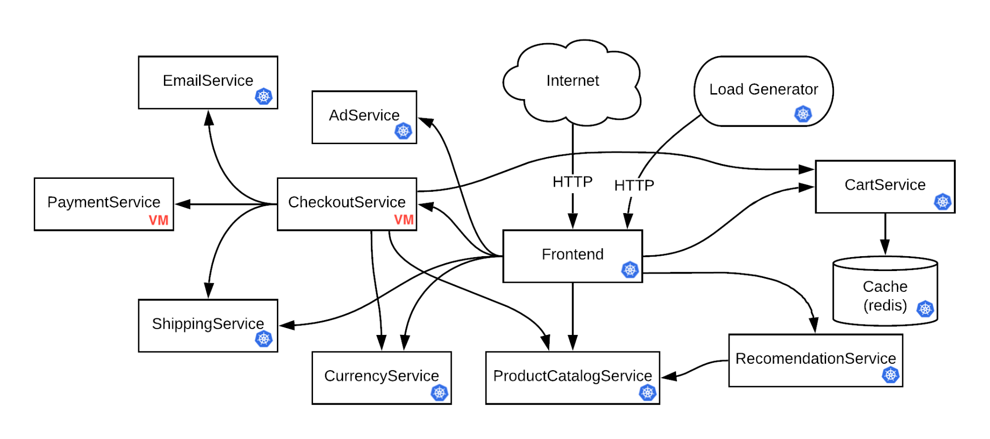VM (e.g. Frontend → CheckoutService), VM → Kubernetes (e.g. CheckoutService → ShippingService), and VM → VM (